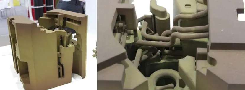 SLS砂铸工艺,砂芯强度达4-6Mpa,精度0.1-0.2mm,适用于复杂管路、油路类产品。