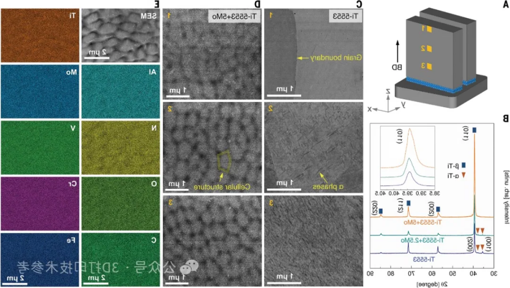新研究带来的重大突破研究人员此次没有使用可能导致钛合金中形成脆性金属间共析体的β-共析稳定剂元素,而是选择了来自β-同晶族的Mo [包括铌 (Nb)、钽 (Ta) 和钒 (V)] 用于Ti-5553(Ti-5Al-5Mo-5V-3Cr)。原位合金化过程中,将钼精确输送到熔池中,在每层扫描期间充当晶体形成和细化的籽晶核。Mo添加剂促进了从大柱状晶向细等轴和窄柱状晶结构的转变。Mo还可以稳定所需的β相并抑制热循环过程中相异质性的形成。